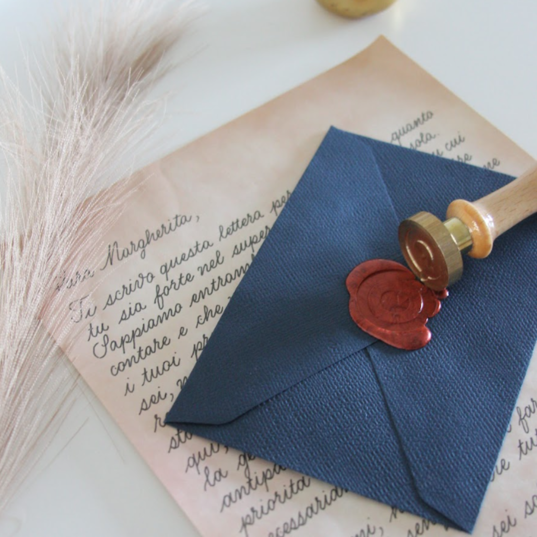 Carta vellutata 100% FATTA A MANO, sigillo in cera lacca, busta raffinata e scatola rigida. Un pezzo unico.