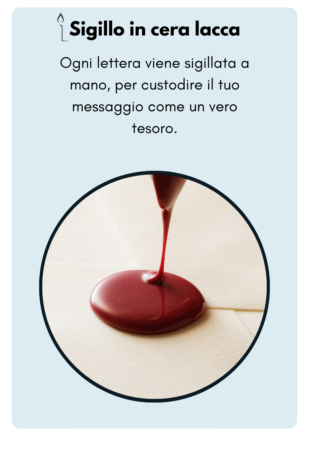 Carta vellutata di alta qualità, sigillo in cera lacca, busta elegante e scatola rigida per custodirla nel tempo.